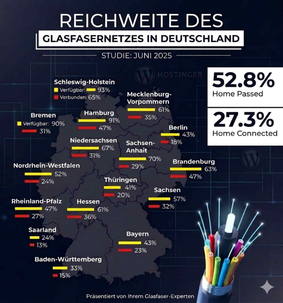 Der Artikel, der auf den Marktanalysezahlen des #BREKO basiert, offenbart bedeutende regionale Unterschiede beim Stand des Glasfaserausbaus. Die Daten bis zum 30. Juni 2025 zeigen Folgendes: