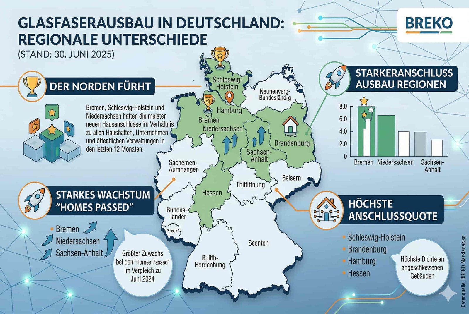 Der Artikel, der auf den Marktanalysezahlen des #BREKO basiert, offenbart bedeutende regionale Unterschiede beim Stand des Glasfaserausbaus. Die Daten bis zum 30. Juni 2025 zeigen Folgendes: